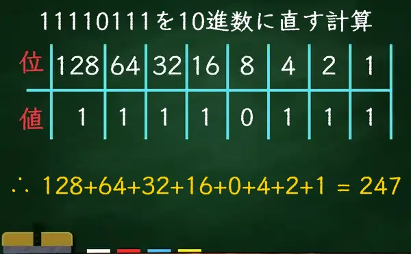 2進数の11110111を10進数に直すと247になります。